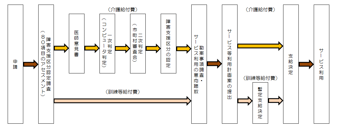 介護給付費は、原則として障がいの状況(障害支援区分等)によって対象者を決定し、訓練等給付費は障がいの状況(障害支援区分等)によらず、障がい者の希望を尊重して決定します。(サービス内容に適合しない場合は対象外となります)