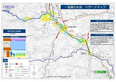 「ため池ハザードマップ」には、浸水する範囲や深さの予想、避難場所、避難経路等を表示しています。