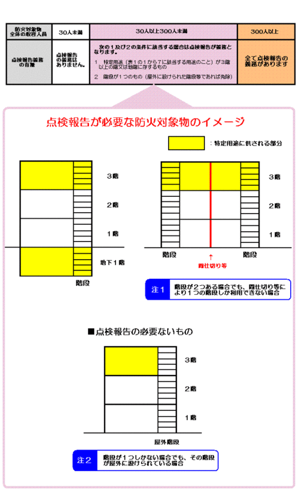 添付ファイルで示す用途に使われている部分のある防火対象物では、下図の条件に応じて防火対象物全体で点検報告が義務となります。