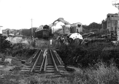 常磐炭礦(湯本町向田) 国道6号と交差していた常磐炭礦の専用鉄道向田線。写真奥に常磐炭礦西部礦の石炭積込場などの施設が見えます。〔昭和51(1976)年7月 須永秀夫氏撮影〕