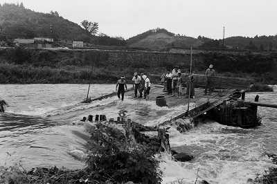 遠野町滝のアユ簗場(昭和55年6月、いわき市撮影):高柴ダム完成後に鮫川渓谷から遠野町滝に移されました