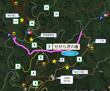 また、この道は2つの入口が、それぞれの林道(石森線、絹谷石森線)に接している以外に、道の途中途中で、No.4「いこいの道」やNo.5「さえずりの道」、No.6「いこいの森小道」、No.8「小富士岩の道」、No.9「マンサクの道」につながります。