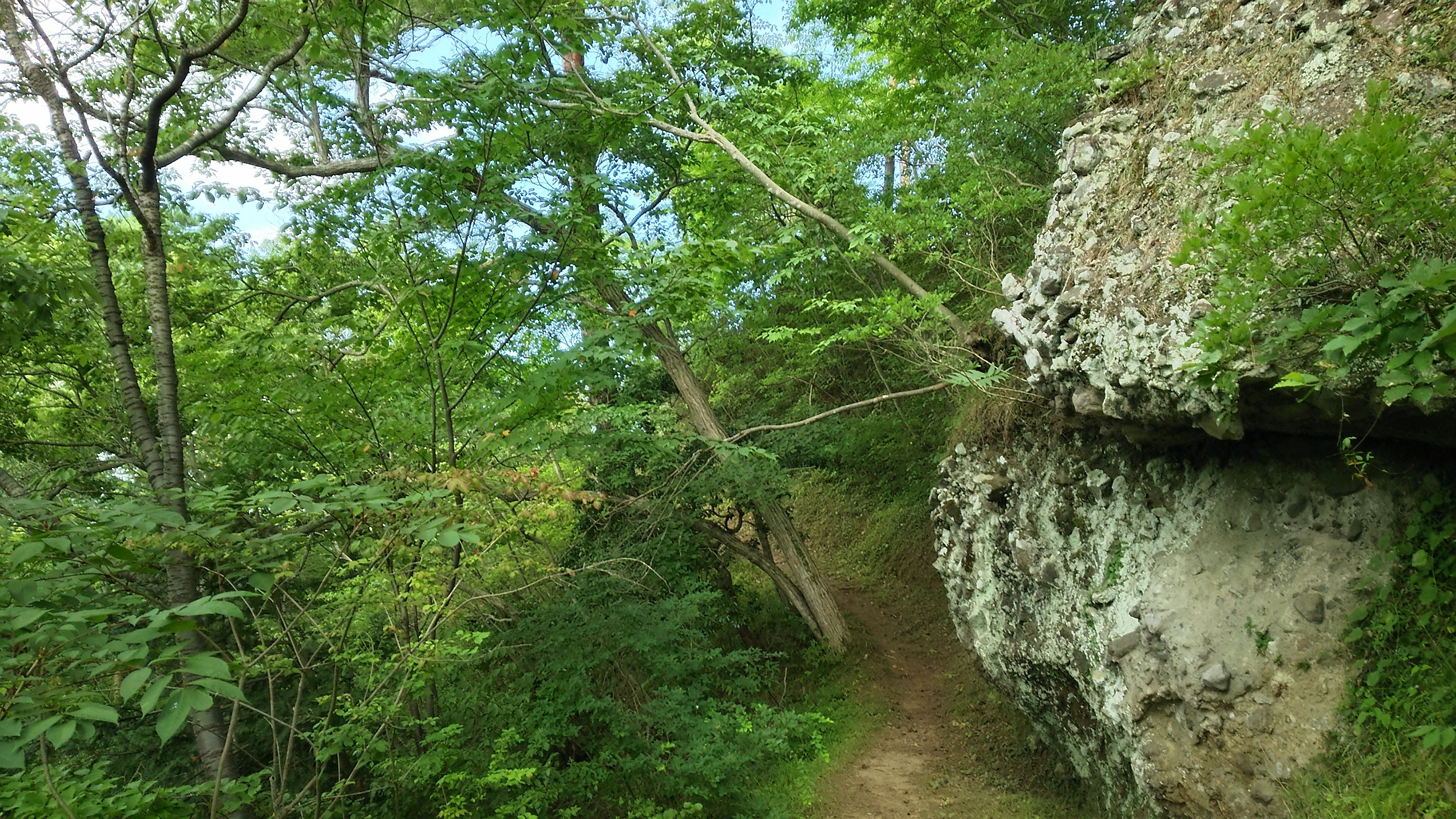 上の写真から「小富士岩の道」を進み、裏側から見た絹谷小富士です。草木が生い茂り見づらいですが、葉と葉の間から岩肌が見えます。(H28.8.2撮影)