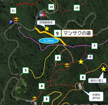 No.11「太陽の道」入口にある駐車場から、林道石森線を四倉方面に向かって進むとすぐ右側に看板が見えてきます。No.7「せせらぎの道」入口から約30mほどの距離にあります。(H28.8.1撮影)