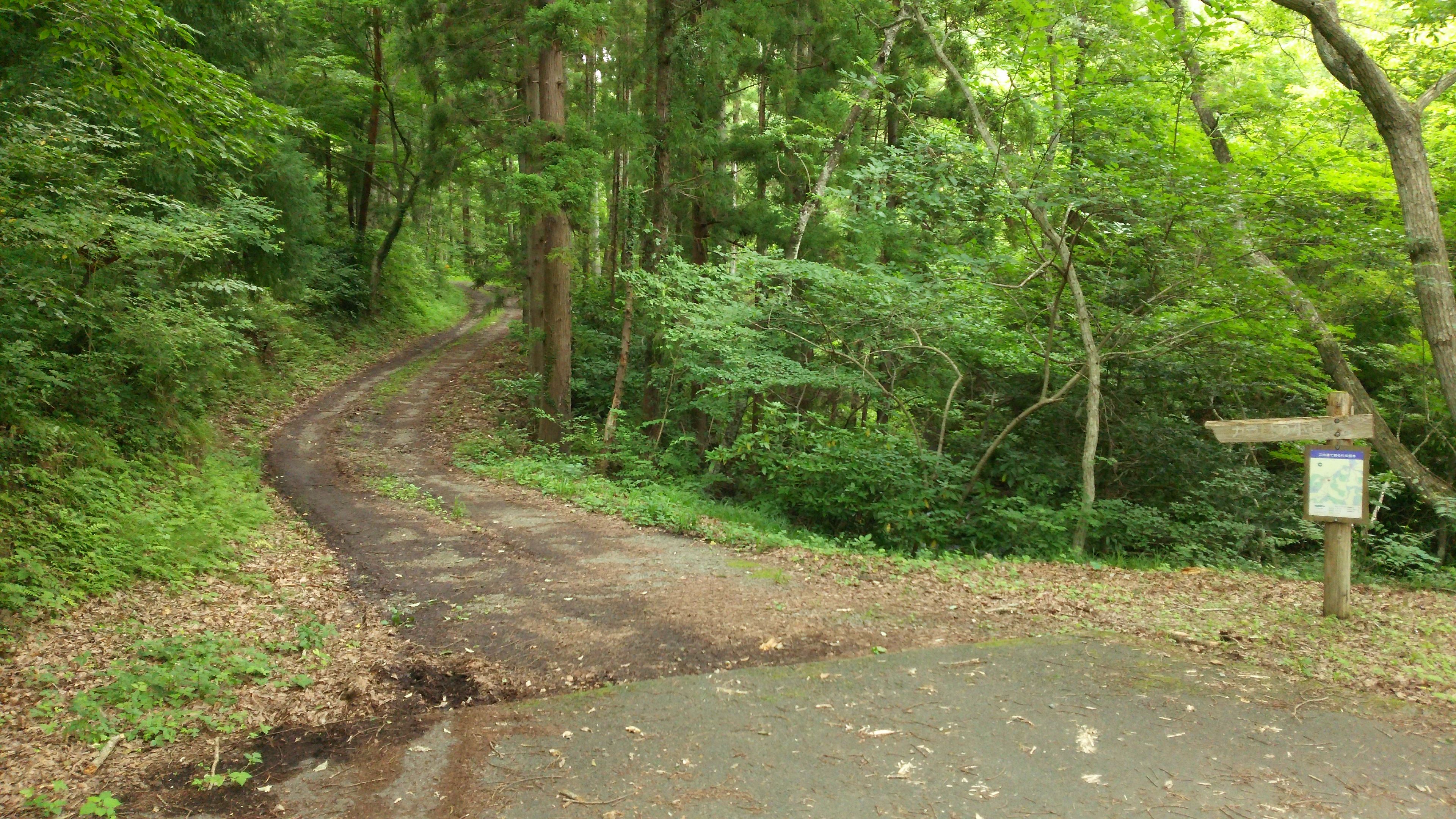 林道の入口から約300mほど進むと、No.15「乙女の道」との合流地点にぶつかります。「カラ松の小道」は看板(写真中央やや右)を右に進みます。まっすぐ行くと「乙女の道」ですぐに野鳥観察舎が見えてきます。(H28.7.29撮影)