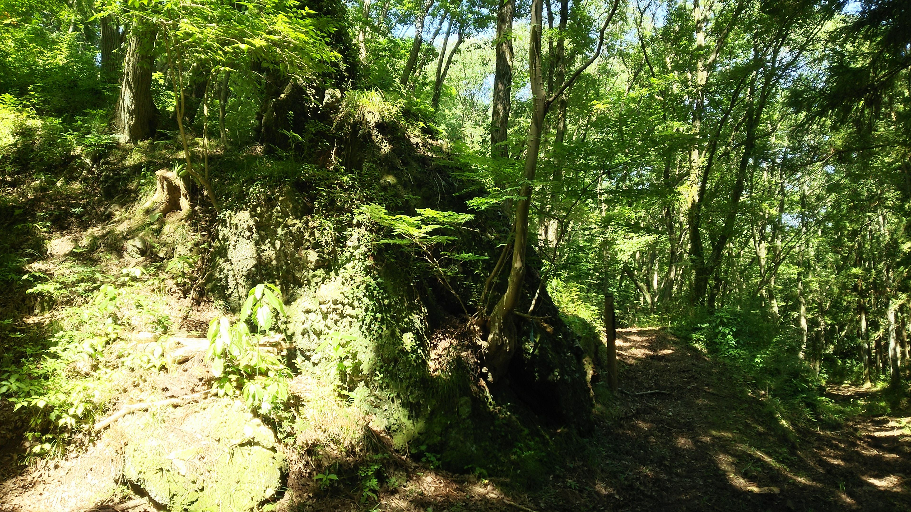 No.15「乙女の道」との合流地点にある仏岩(左)です。「乙女の道」からNo.16「カラ松の小道」に向けて撮影。(H28.7.29撮影)