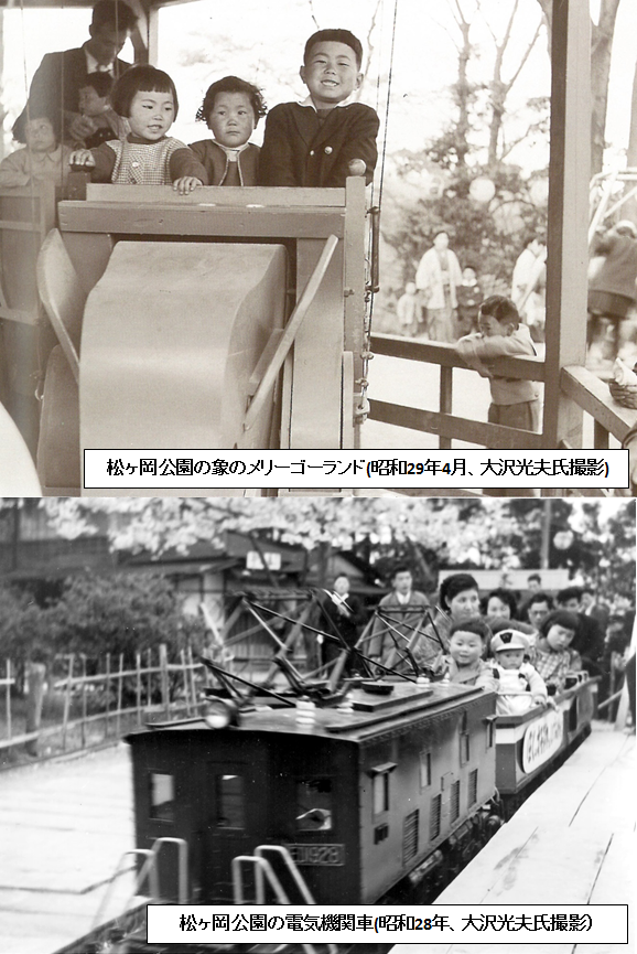 上:松ヶ岡公園の像のメリーゴーランド〔昭和29(1954)年4月、大沢光夫氏撮影〕