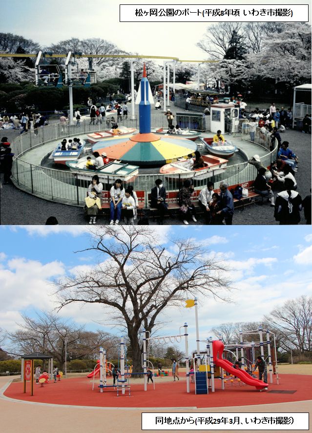 平市は急ごしらえで遊戯施設の設置位置を松ヶ岡公園内に変更し、豆電車(遊覧鉄道)、飛行塔、木製二人乗り象メリーゴーランドの三つを建設し、昭和28年4月にオープンさせました。