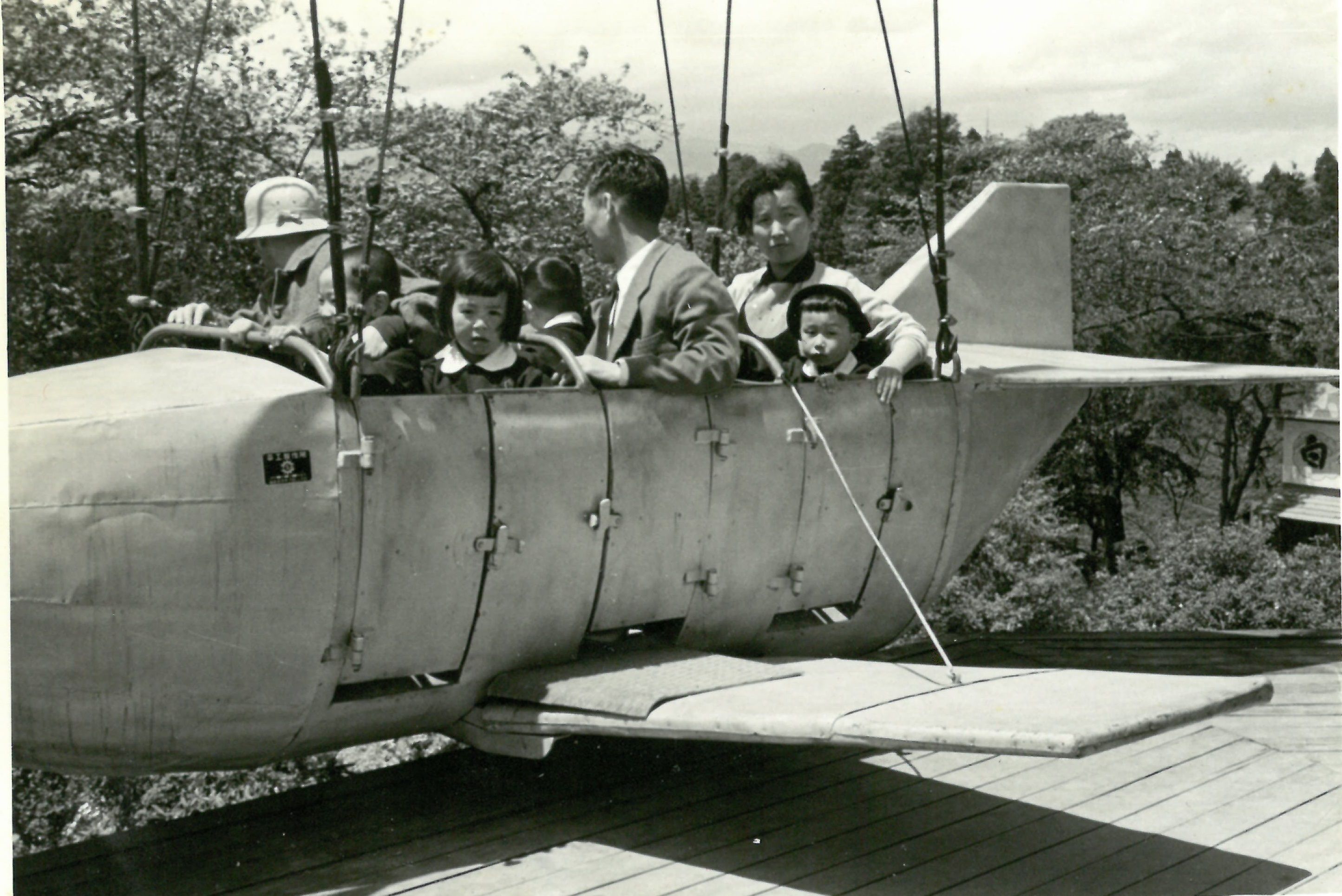 その後、遊戯施設は社会変化や老朽化に対応していくことになります。電気機関車は昭和36(1961)年には「こだま型」の電車に受け継がれました。昭和31(1956)年4月には観覧車が登場、さらに、昭和32(1957)年には飛行塔(昭和53年にロケット飛行塔に変更)を設置しました。次いで昭和56(1981)年には観覧車がサイクルモノレールに更新されました。