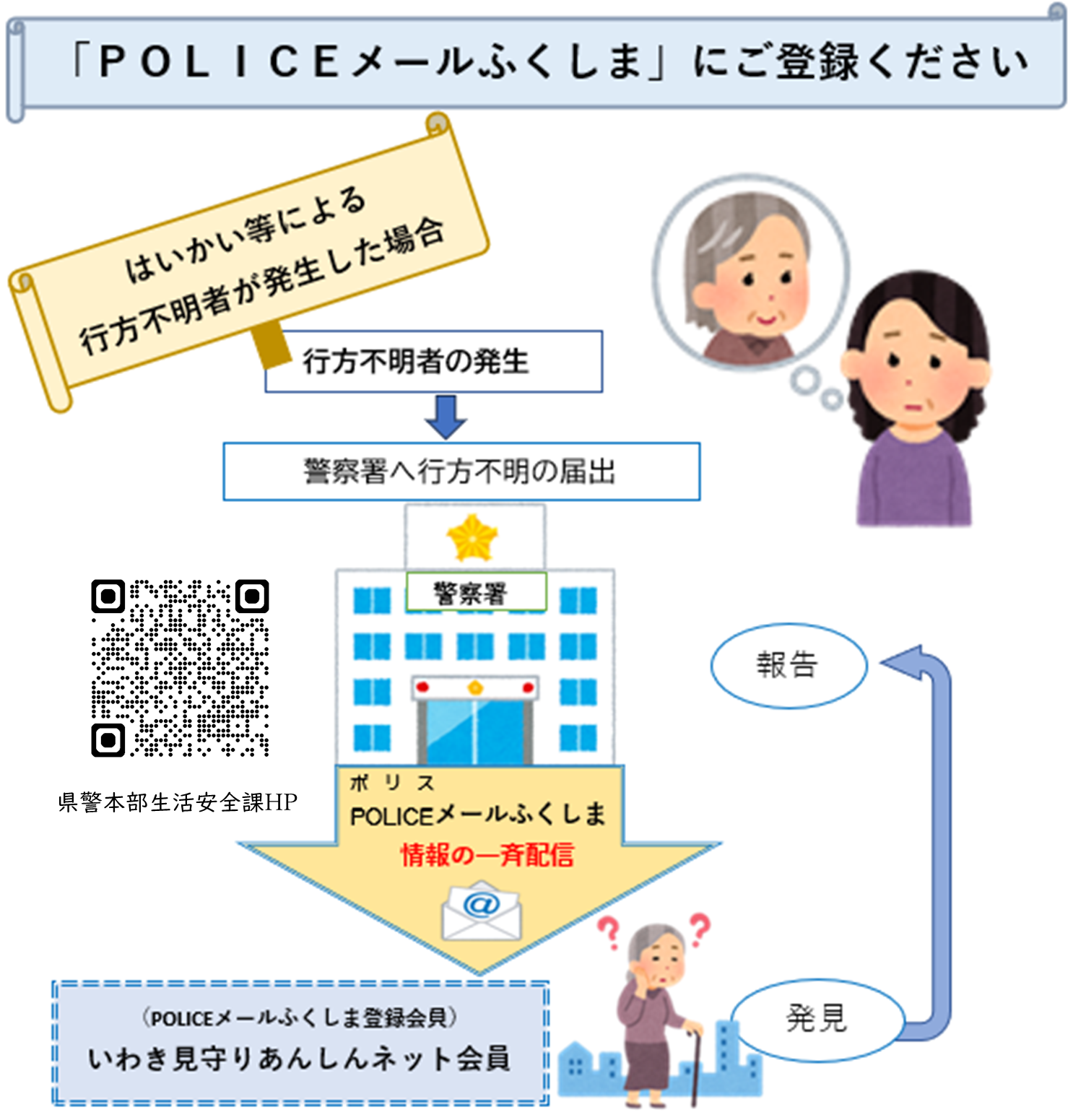 会員の皆さまに「POLICEメールふくしま」にご登録いただき、行方不明者が発生した際に、迅速な情報が届く仕組みとしてご活用いただくこととしています。