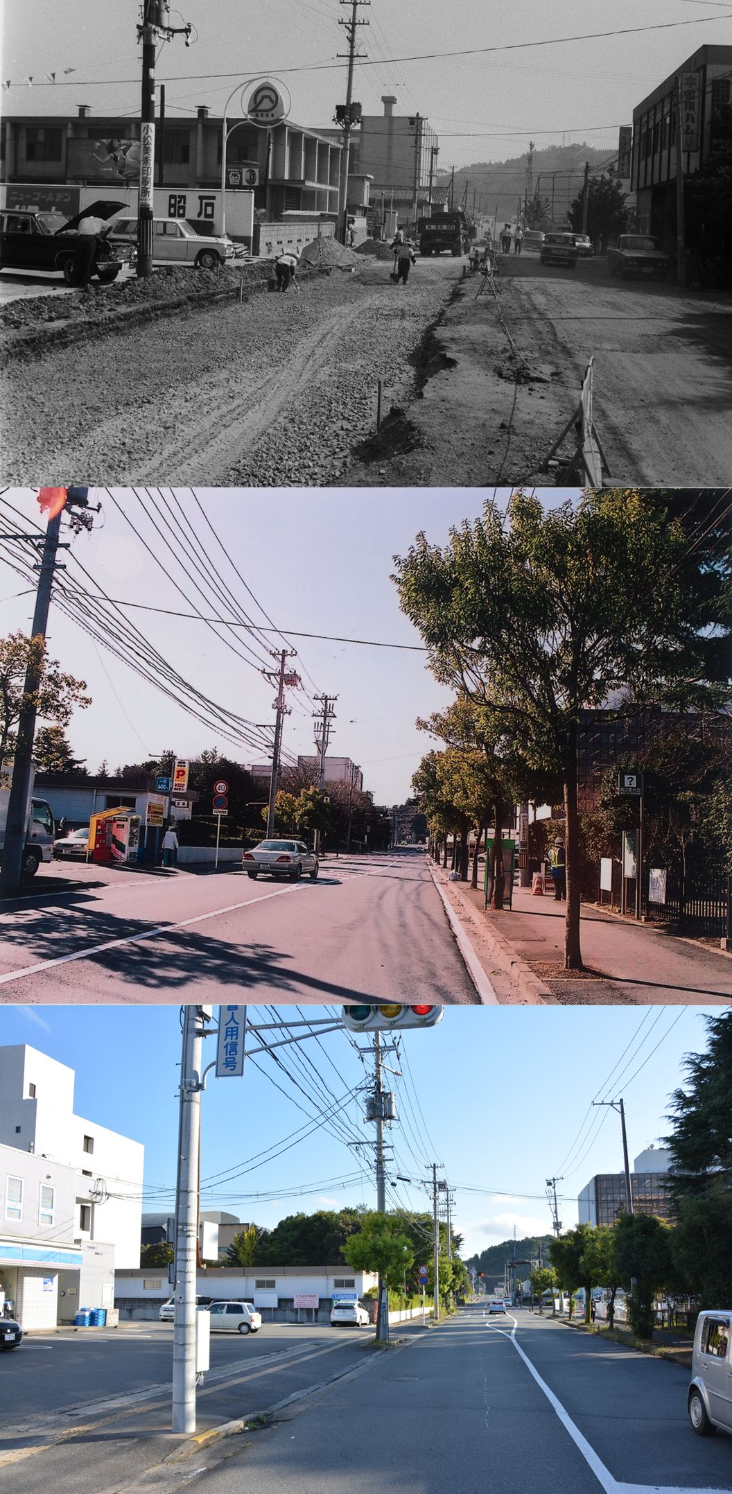 (上)後の文化センターと市立美術館の間の市道〔昭和44(1969)年9月、いわき市撮影〕