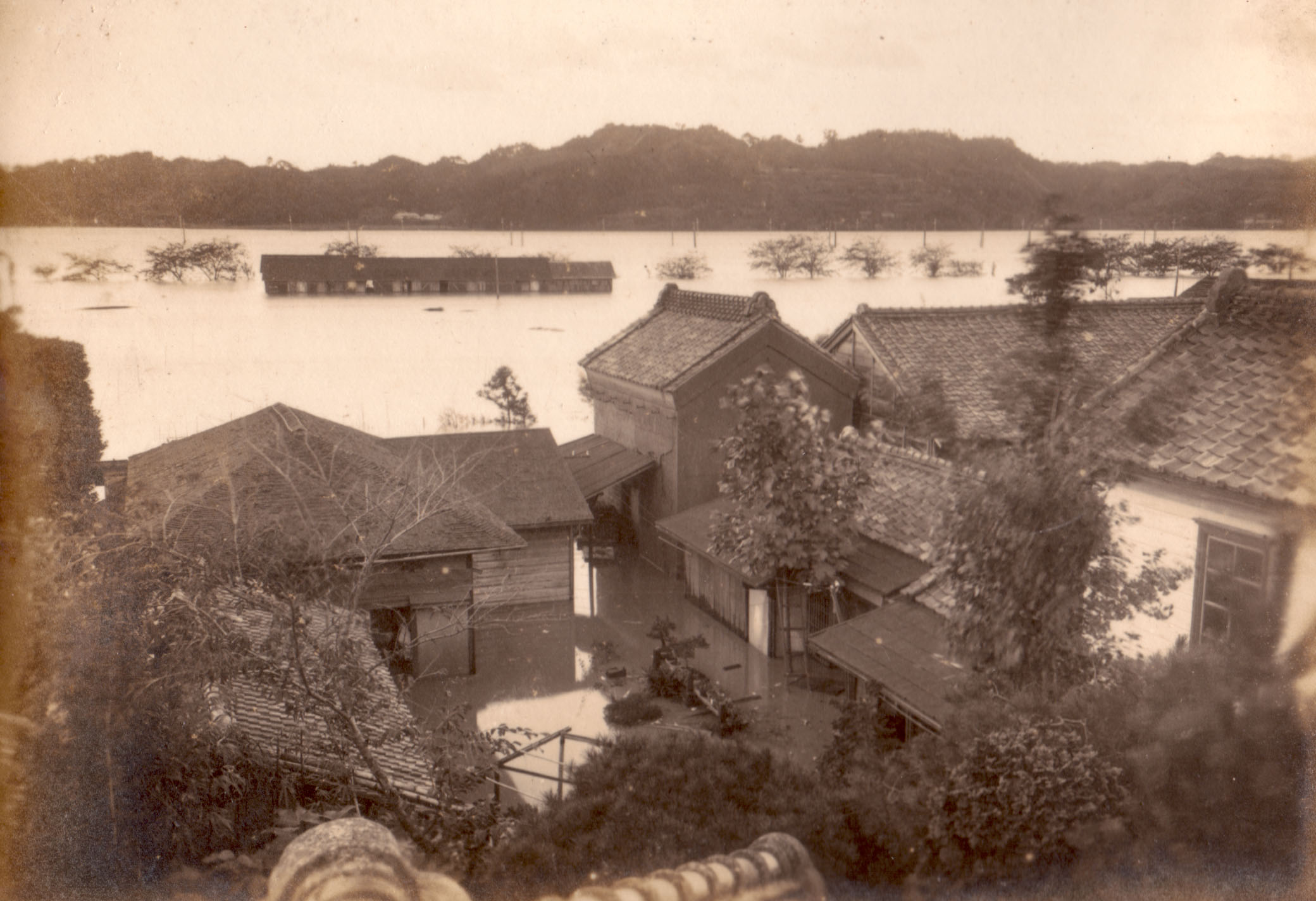 さて、今回取り上げたのは約100年前の写真で、平市街南端の新川流域(現新川緑地)の洪水被害を撮影したものです。100年前の写真をみるとき、水没して何も見えない部分が見渡す限りの水田だったことを知らなければ、建物が水没してしまったと見間違うかもしれません。