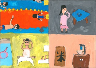 - 明るく、のびのびとした作品が多くありました。また、発想(考え)が広がる4年生らしく、水に関わる様々なことを表現しようと工夫している絵が多くありました。水に対する体験が増えてきた4年生だからだと感じています。