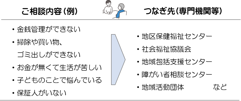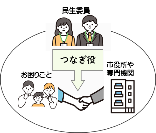 民生委員は、さまざまな福祉サービスにつなぐことで、あなたの困りごとに対応します。