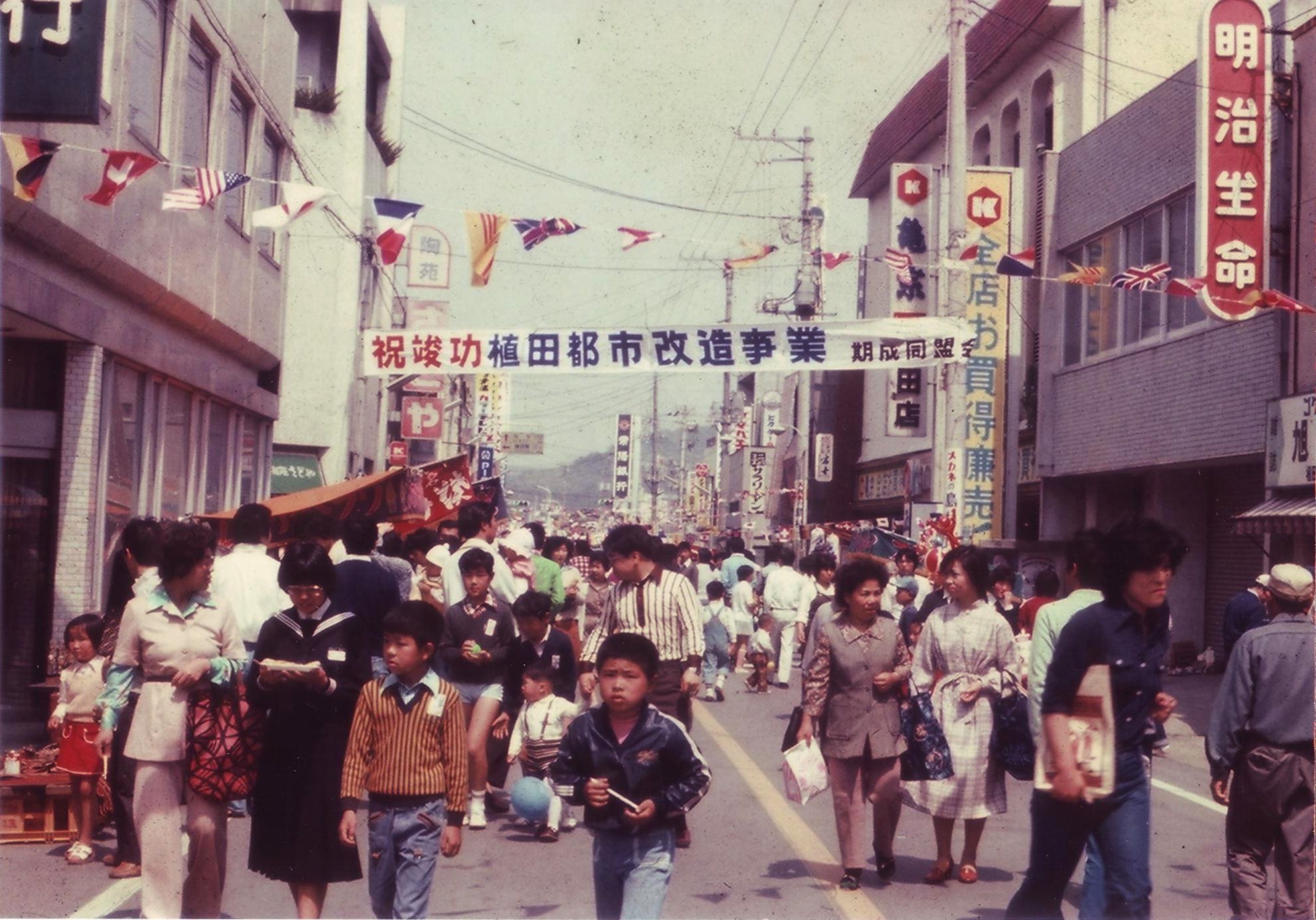 植田本町通り(昭和52年4月から主要地方道いわき-上三坂-小野線へ変更)の慢性的な交通渋滞が解消されたことから、かつての「市」を新たな形で復活させようという動きが起こりました。“道路を歩行者に解放”という、全国に広がる「歩行者天国」ブームが後押したのです。待望の歩行者天国は昭和48(1973)年9月に行われ、現在は毎年5月5日の「こどもの日」に移行して続けられています。
