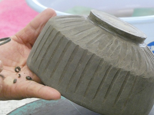 秤屋先生からのアドバイスを聞きながら、前回作ったうつわの底にサインを入れます。