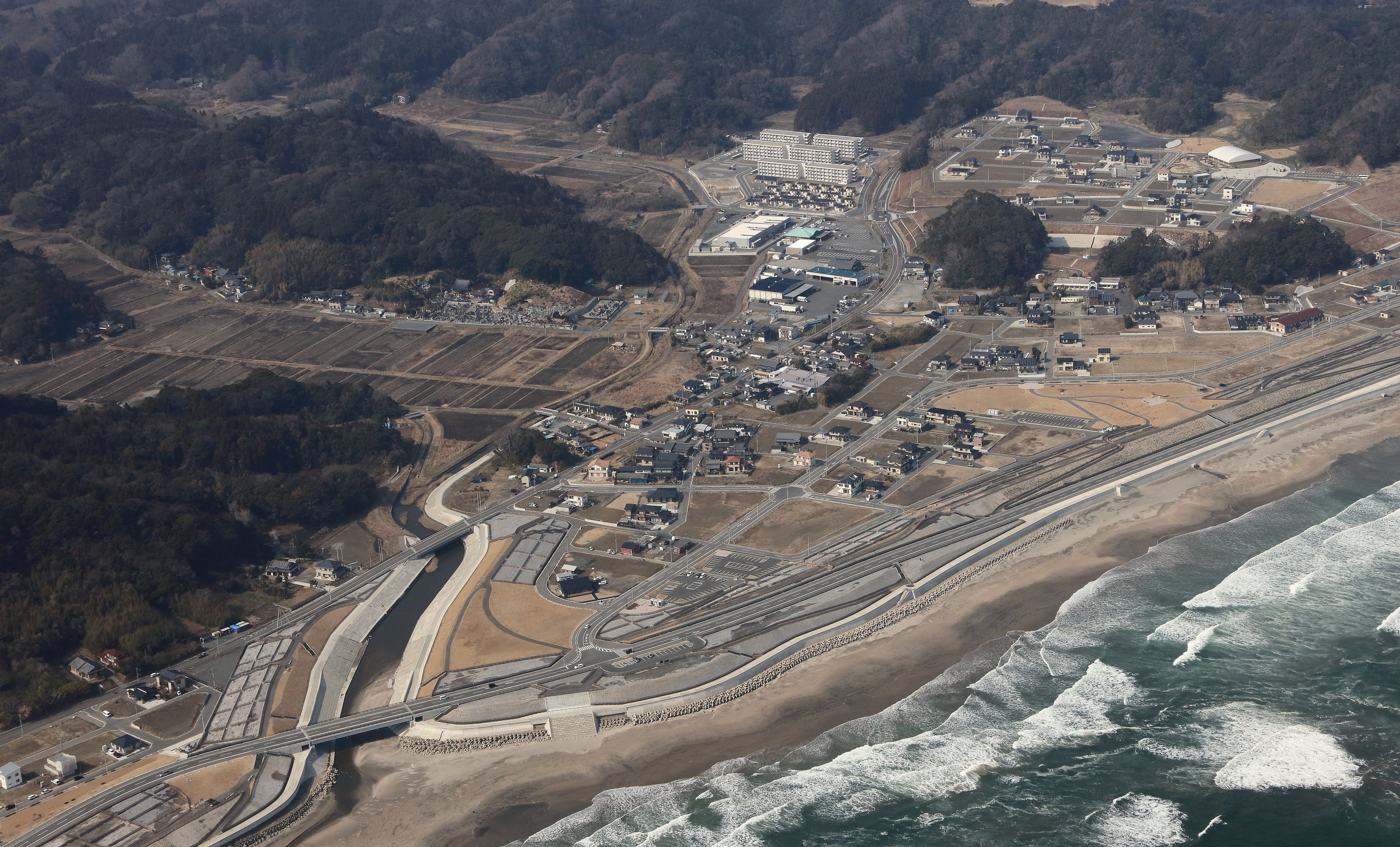 豊間震災復興土地区画整理事業区域を北西側上空から南東に向かって見る(平成31年3月、いわき市撮影)
