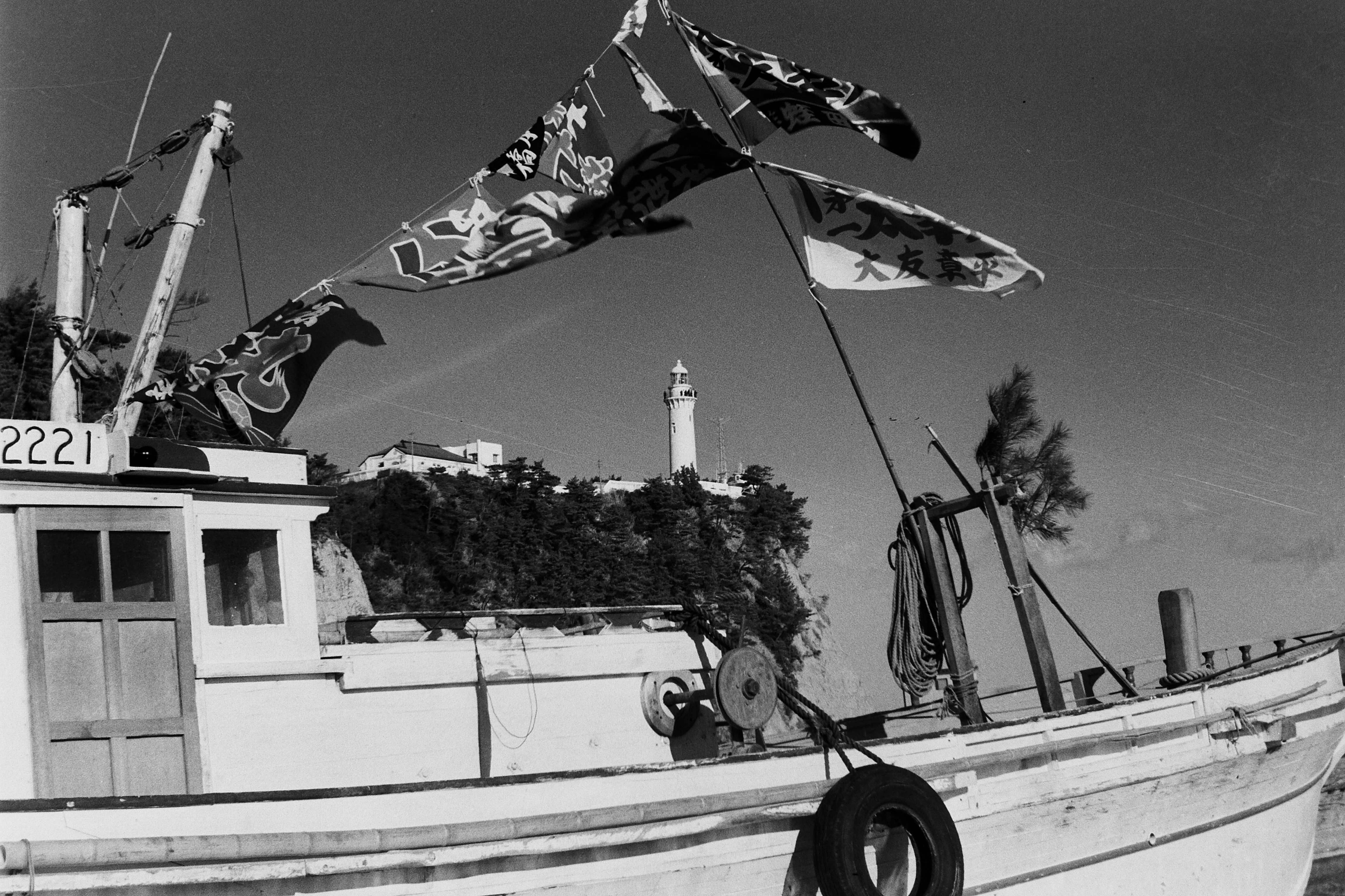 豊間港漁船、大漁旗と塩屋埼灯台(昭和42年1月、渡辺聖一氏提供)