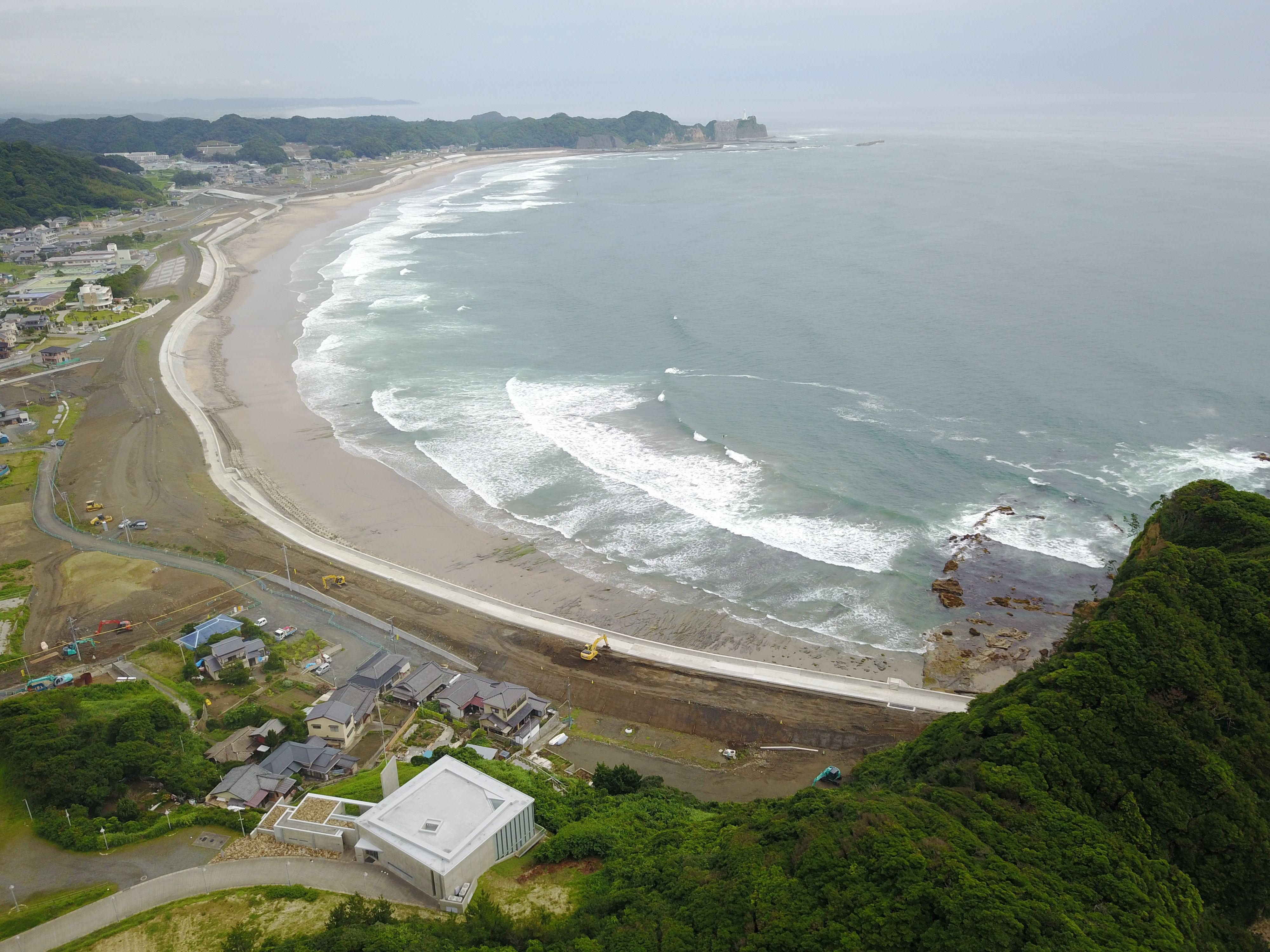 合磯海岸を含む豊間海岸は、平成28(2016)年度に防潮堤かさ上げ工事が完成しました。