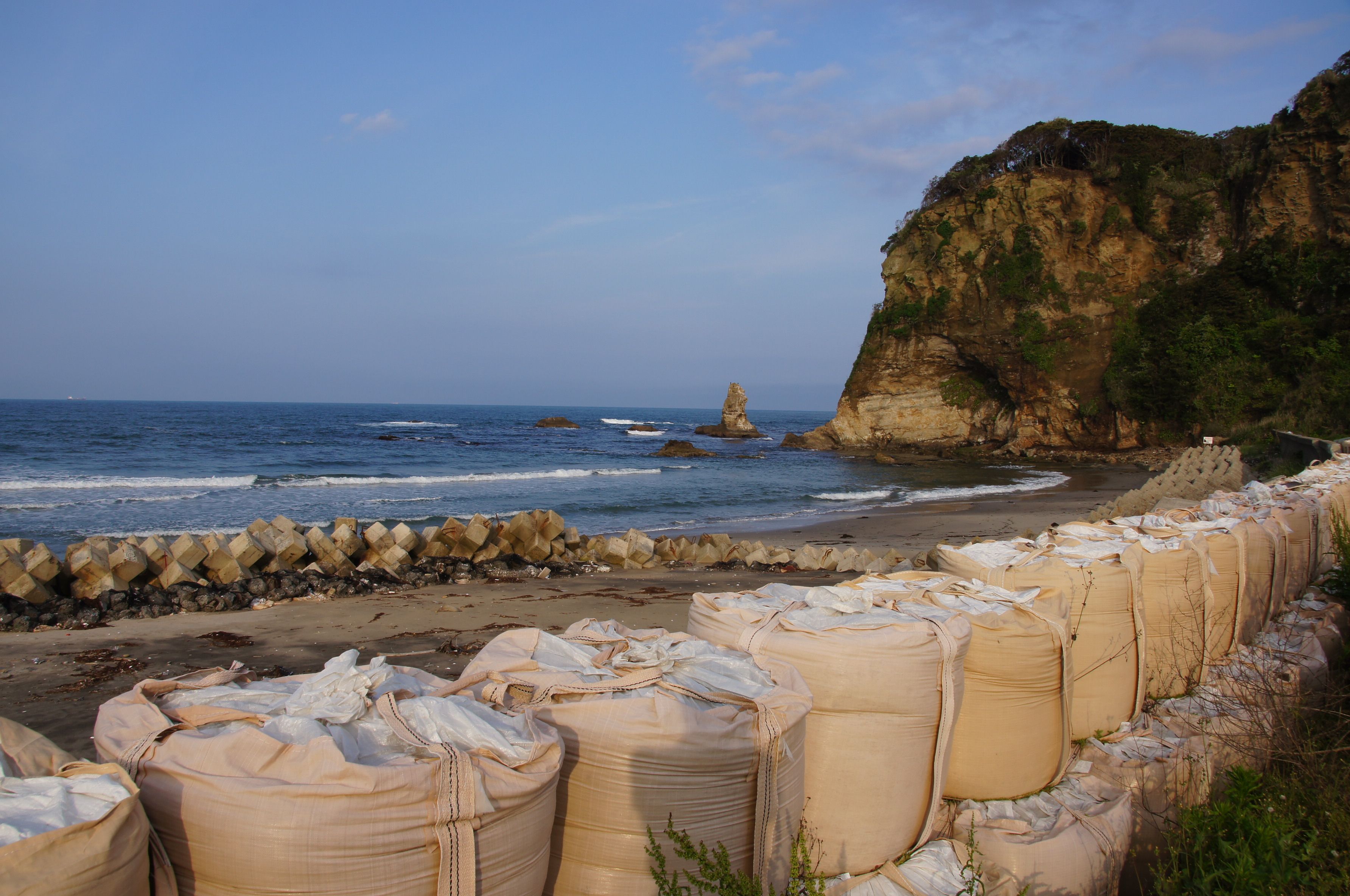 仮設の防潮堤が設置(平成26年5月、いわき市撮影)