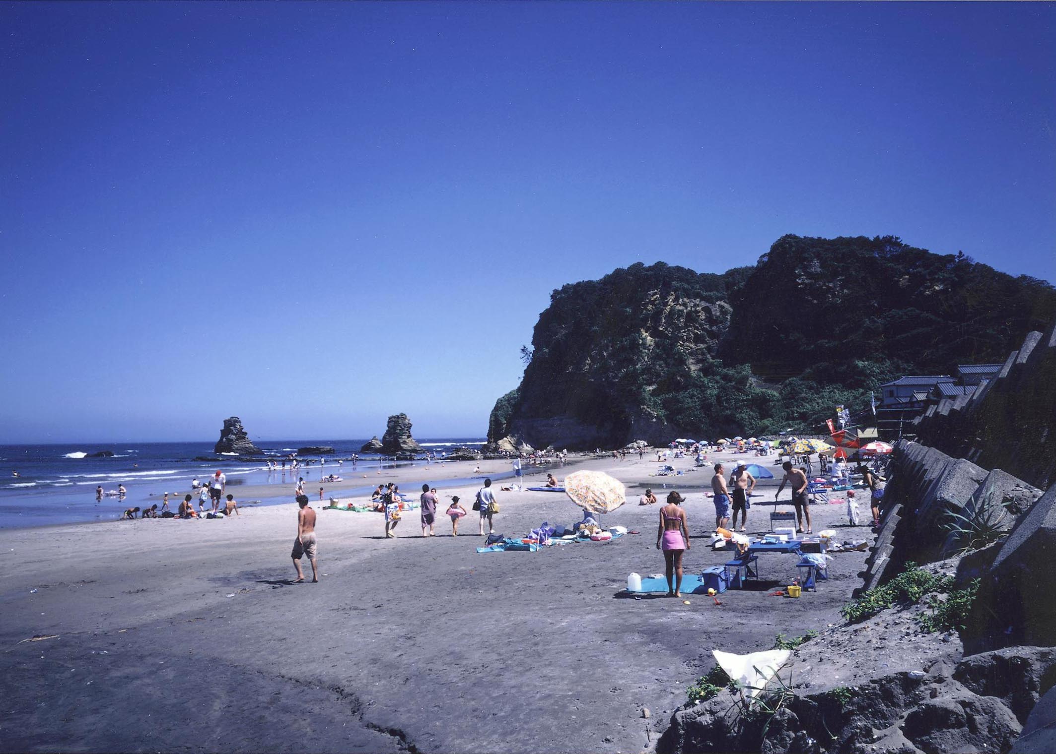 合磯海水浴場と二見ケ浦(平成11年7月、いわき市撮影)