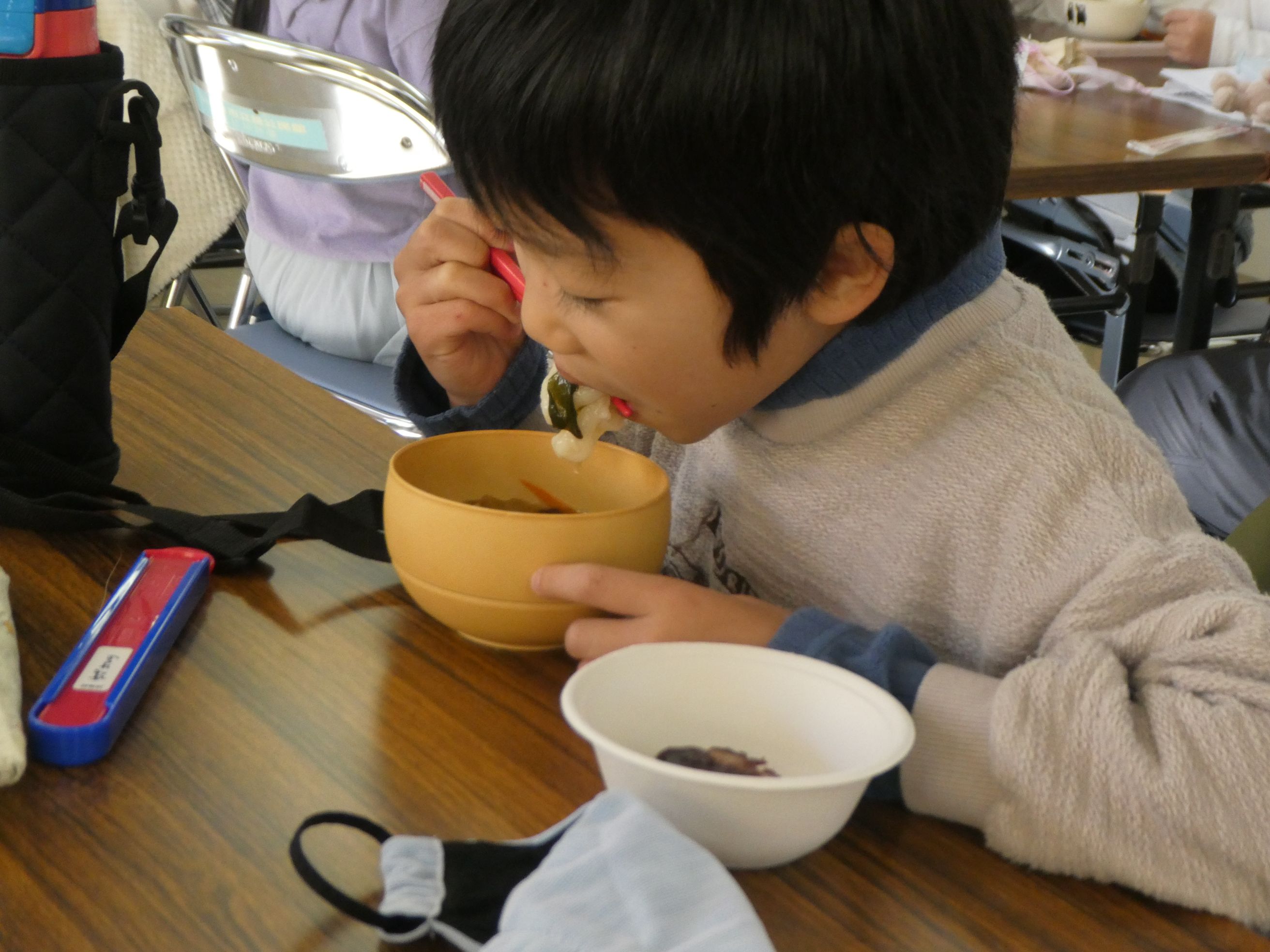 昼食です。婦人会さんがよそってくれて、みんなでいただきます!