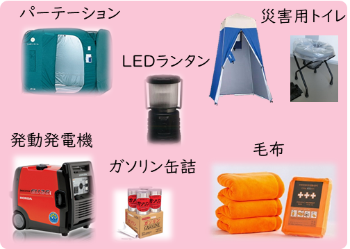 毛布、発動発電機、投光器、LEDランタン、非常用トイレ、パーテーション、ガソリン缶詰、生理用品、おむつ(子ども用・大人用)、体温計、手指消毒液、ハンドソープ、ウェットティッシュ、蓄電池、歩行器、歩行補助杖、車いす、マットレス、防寒・防風アルミシート など |