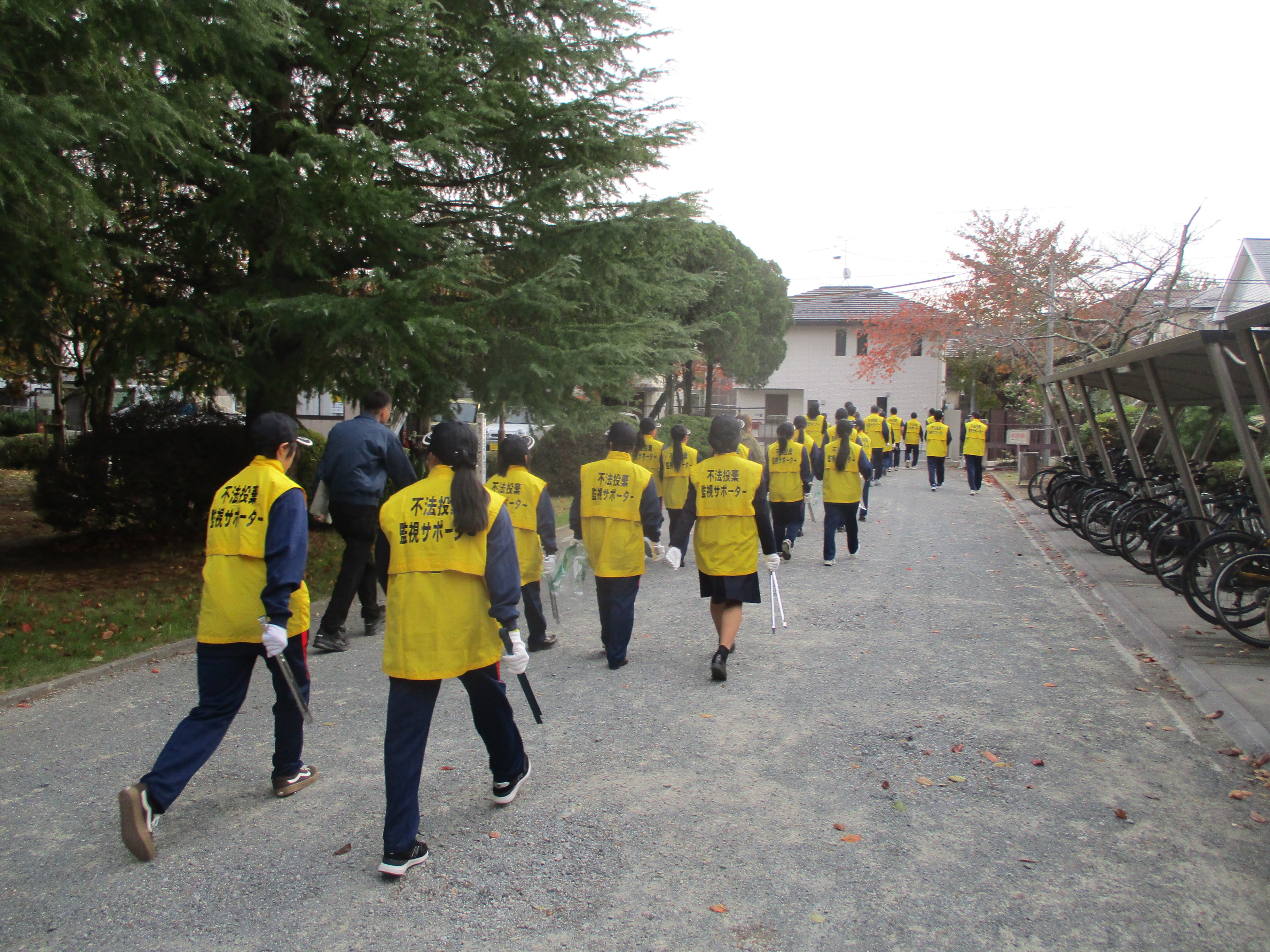 去る令和5年10月13日(金)に、1年生の各クラスの美化委員各2名と参加希望者を合わせた合計約30名で、学校周辺の環境美化活動を実施しながら、不法投棄防止パトロールを実施しました。