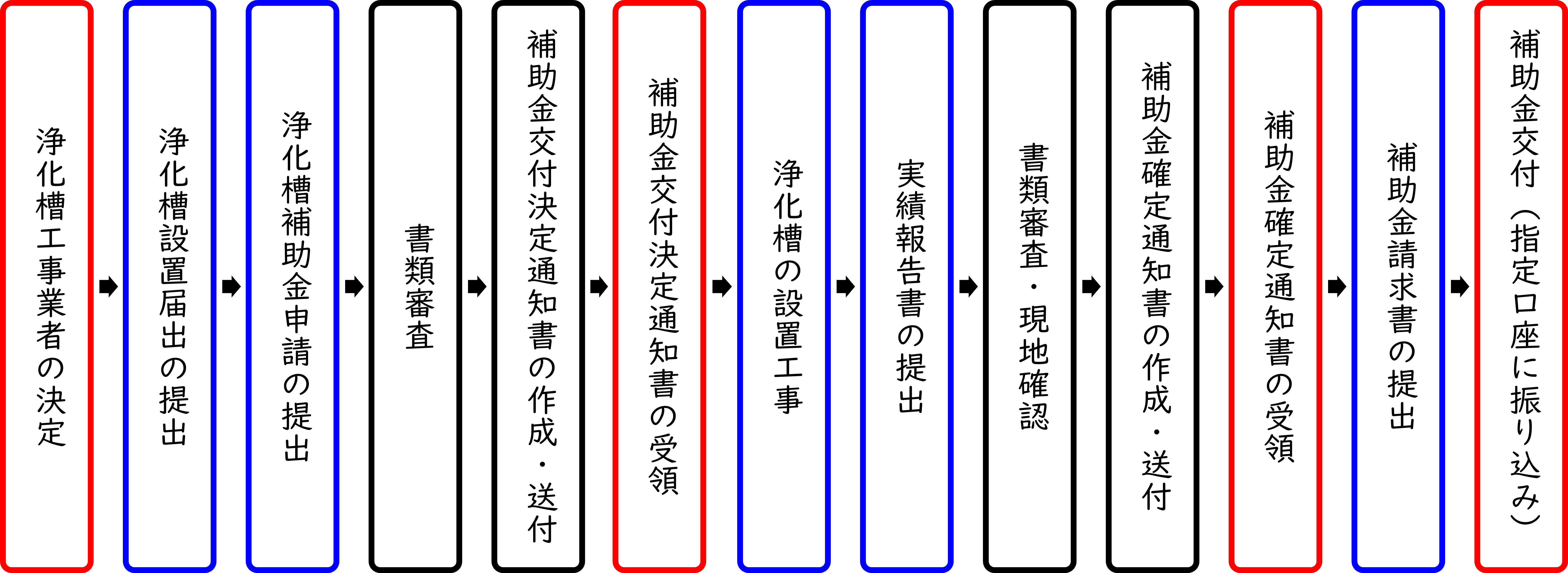 ・青枠は申請者・浄化槽施工業者どちらでも手続きは可能となっておりますが、工事に係る専門的な書類(図面等)もあるため、浄化槽施工業者による手続きをお勧めします。