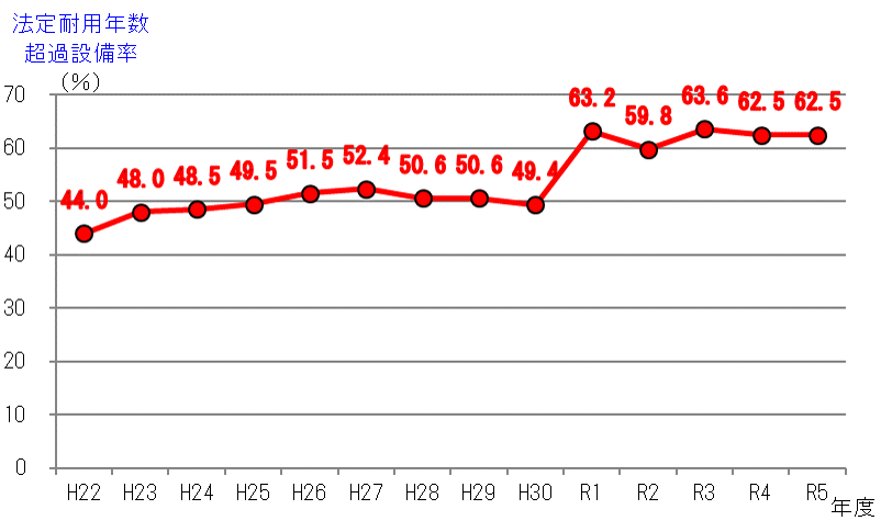 また、令和元年度以降、水道施設の設備類の半数以上が法定耐用年数を超過しており、日常における事故リスクの高まりや災害発生時における被害の深刻化が懸念されます。