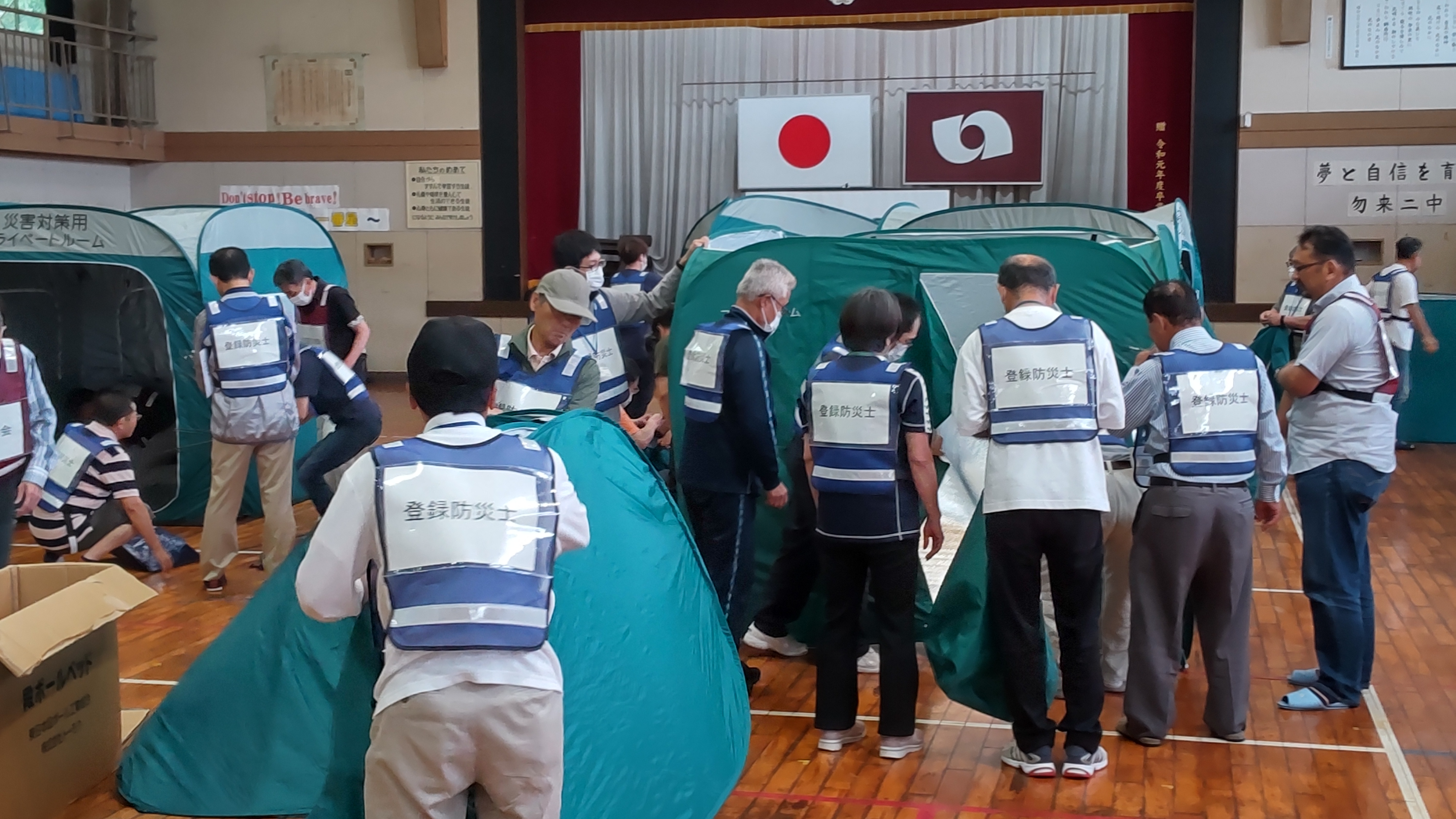 昨年度は登録防災士として活動いただくために必要な知識・技能の修得を目的として、スキルアップ研修を4回開催し、うち1回において避難所・開設運営の手順や資機材の取扱いなど基礎的な内容について、座学や実技を通じて学んでいただきました。