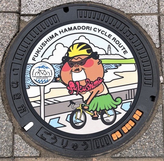 ナショナルサイクルルートの指定を目指している「ふくしま浜通りサイクルルート」とコラボした、フラおじさんデザインマンホールができました。