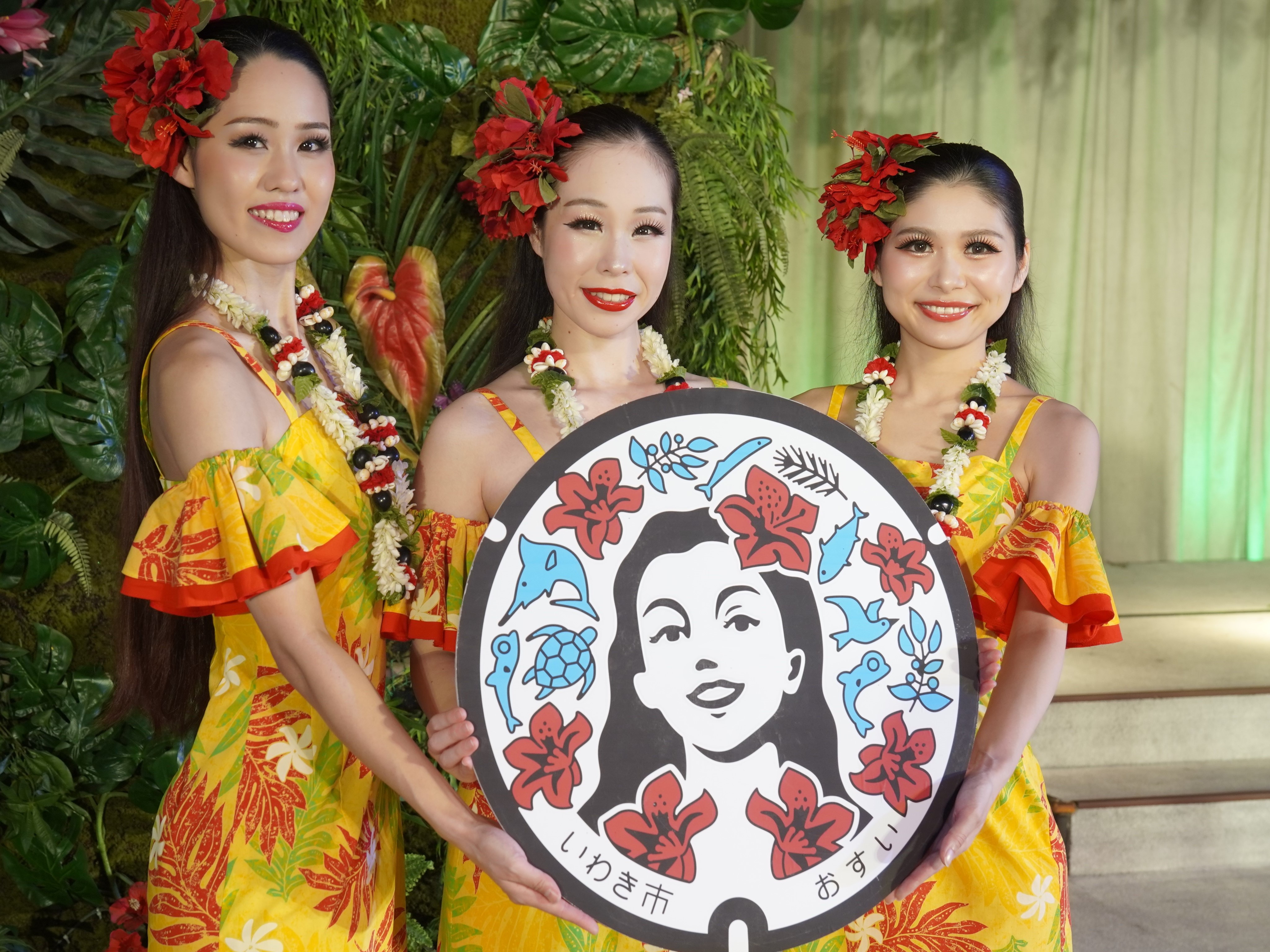 スパリゾートハワイアンズさんのご協力を頂き、フラガールさんたちと一緒に、フラシティマンホールの写真撮影を行いました。