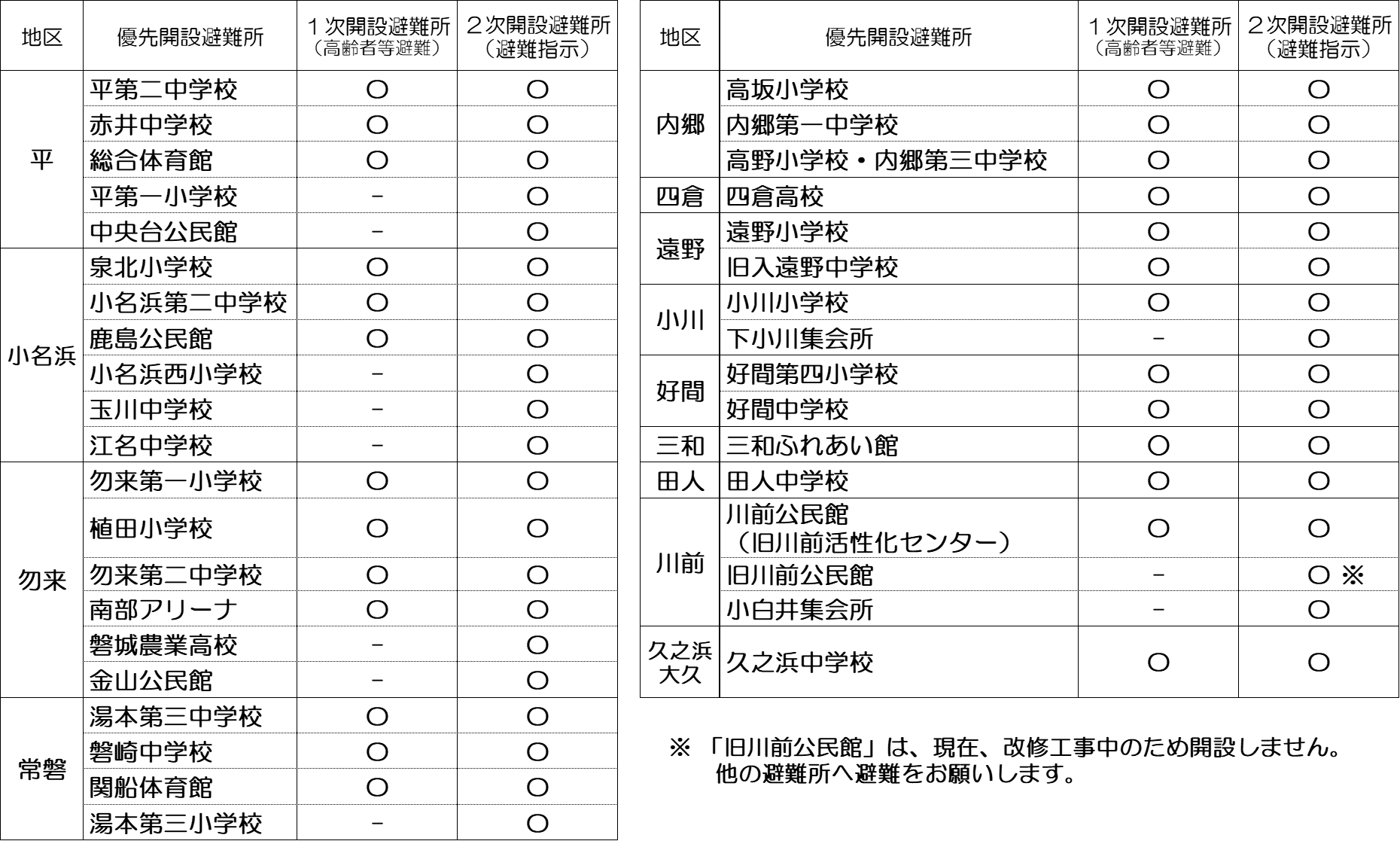 1 優先開設避難所一覧