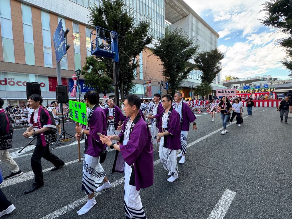 一緒に参加した親子都市由利本荘市訪問団の皆様と『ドンワッセ!』の威勢の良い掛け声のもと、会場である駅前大通りで踊り歩きました。