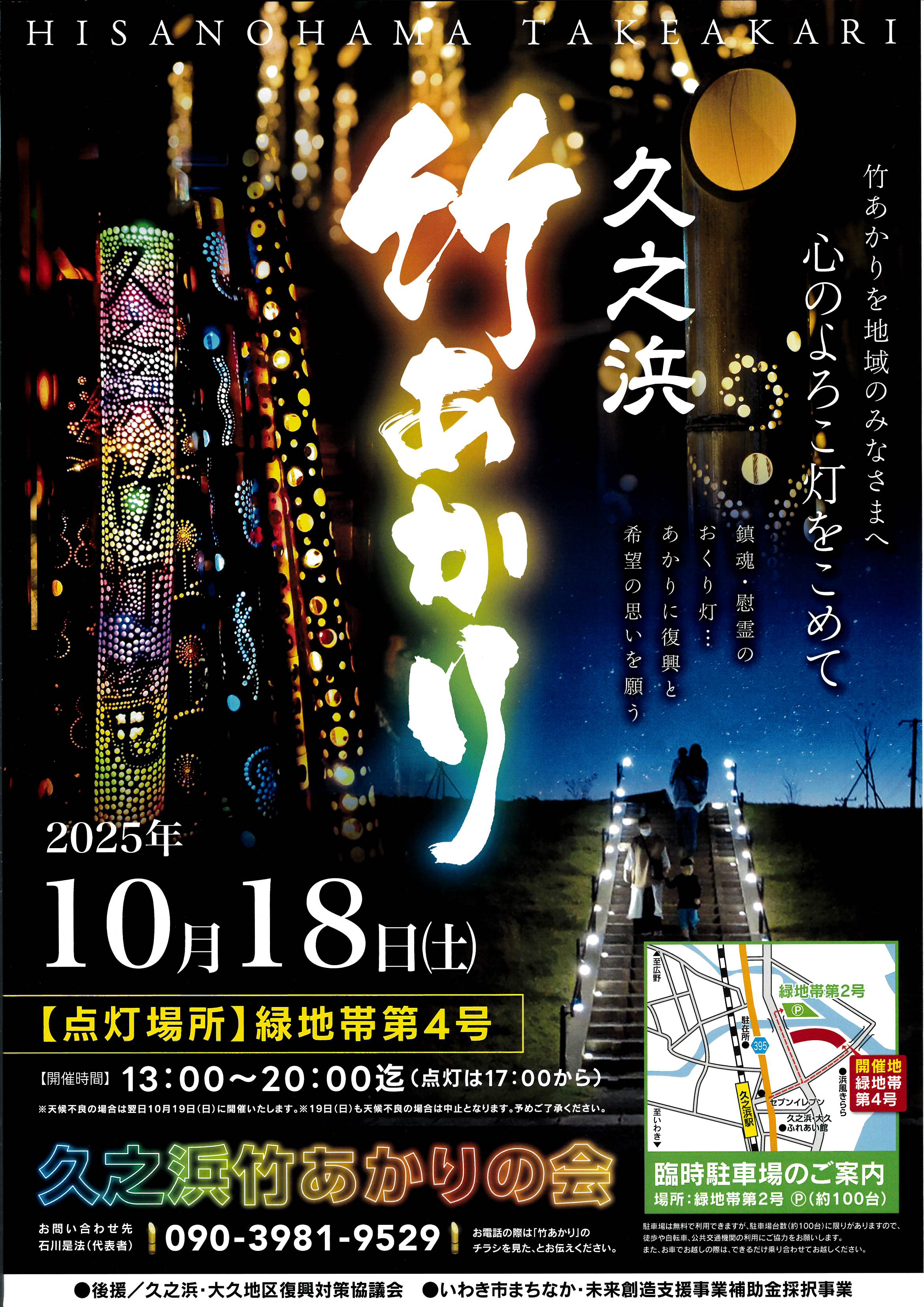 東日本大震災で犠牲にあわれた方々の鎮魂のおくり灯、そのあかりに復興と希望の想いを願い開催される「久之浜竹あかり」が、昨年に引き続き、今年も次のとおり開催されます。