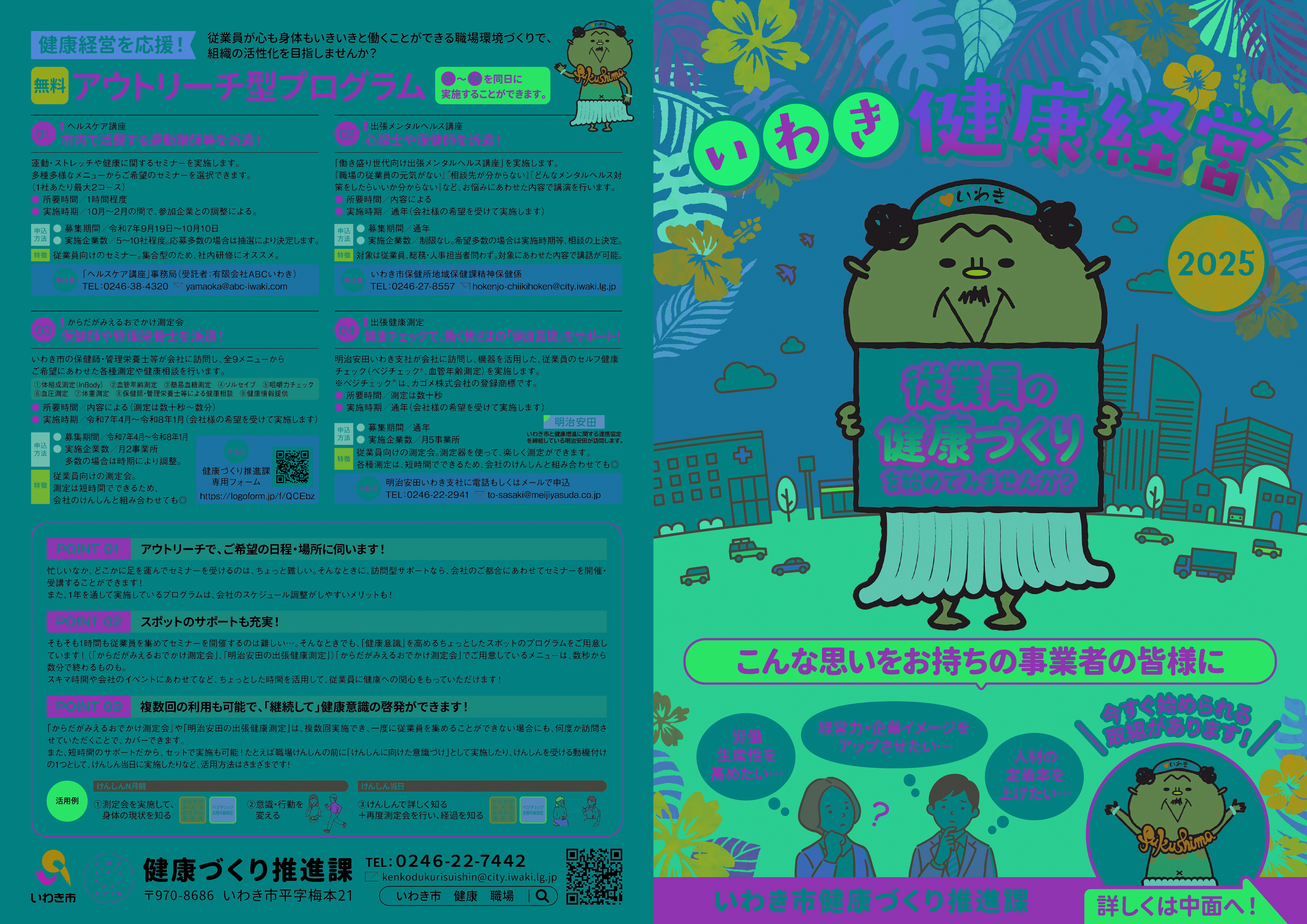 いわき市では、事業者の皆様向けに、『健康経営®に取り組むきっかけになれば』という思いから、健康経営に取り組むメリットや、いますぐできる取組をご紹介するリーフレットを作成しました。