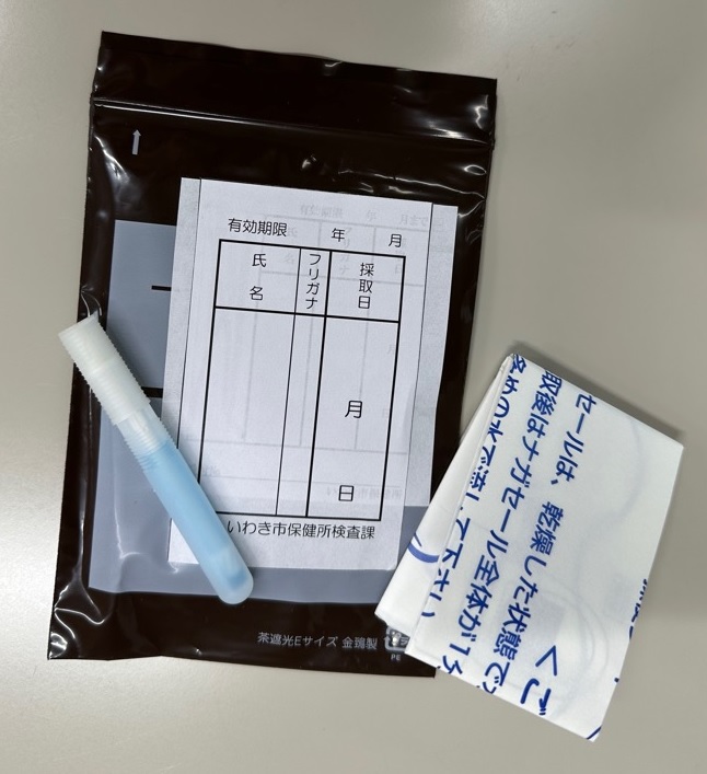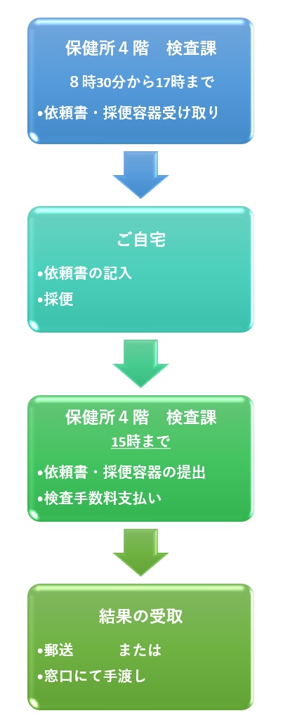- 検査依頼書と採水容器をお渡ししますので、平日の8時30分から17時の間に一度、保健所検査課(4階)までお越し下さい。