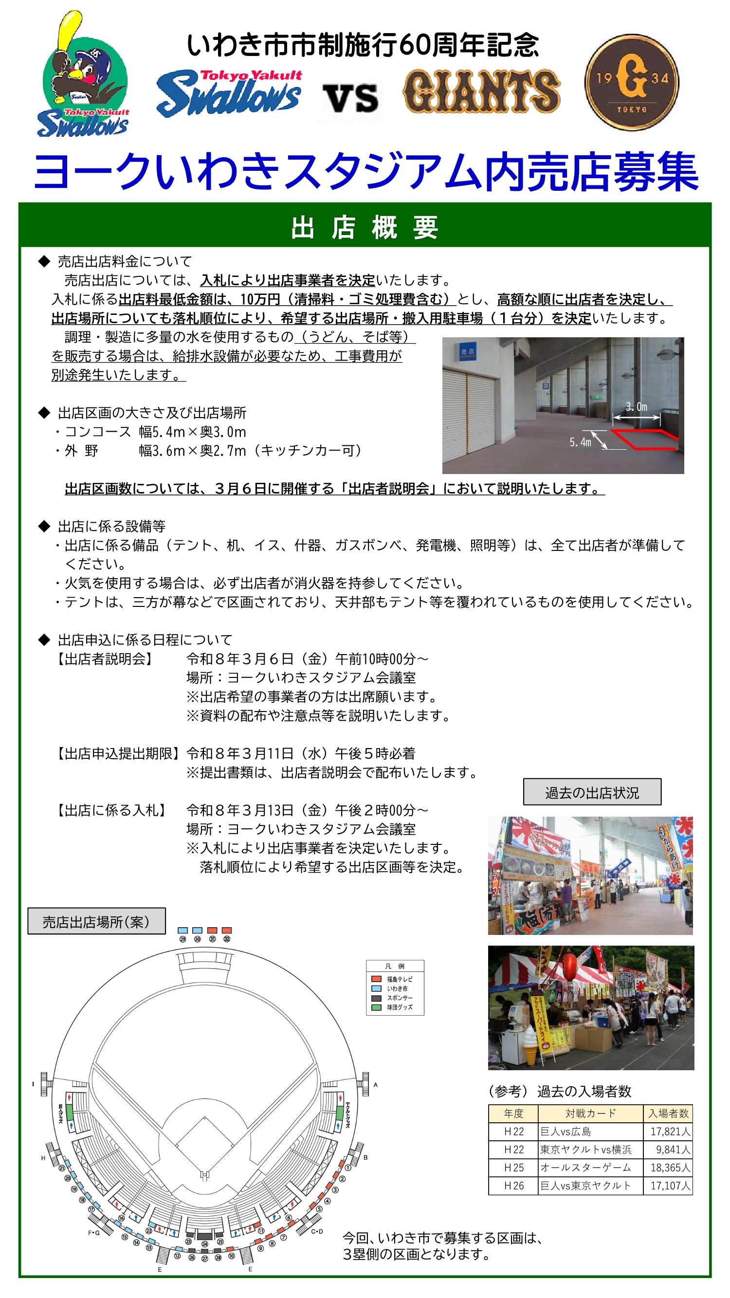 いわき市市制施行60周年記念 「東京ヤクルトスワローズ×読売ジャイアンツ」 臨時売店出店者の募集について