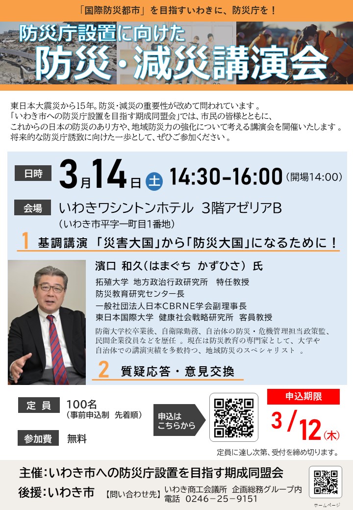 いわき市への防災庁設置を目指す期成同盟会では、市民の皆さまと一緒に「災害に強い地域づくり」を考えるため、防災の第一人者・濱口和久特任教授(拓殖大学 地方行政研究所)をお招きし、講演会を開催します。