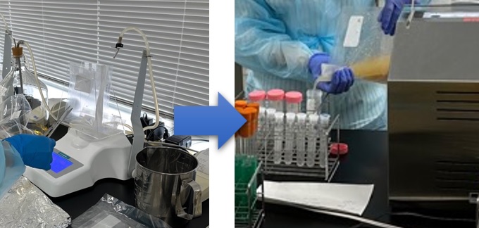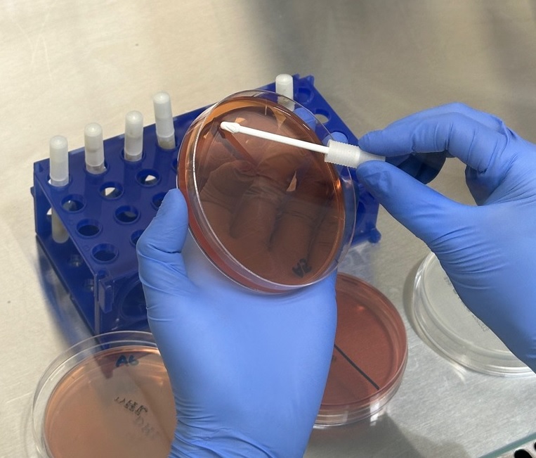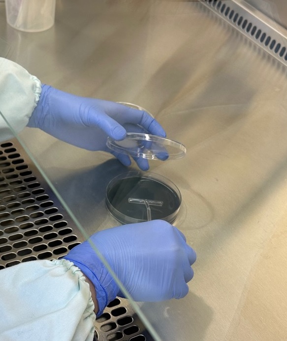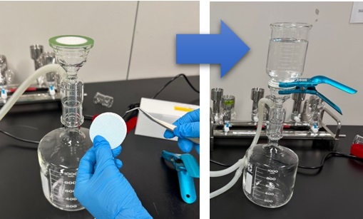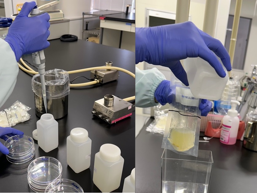 2⃣フィルターに集めた菌を水に浮遊させ、培地に塗り広げ、一定温度で1週間ほど培養します。