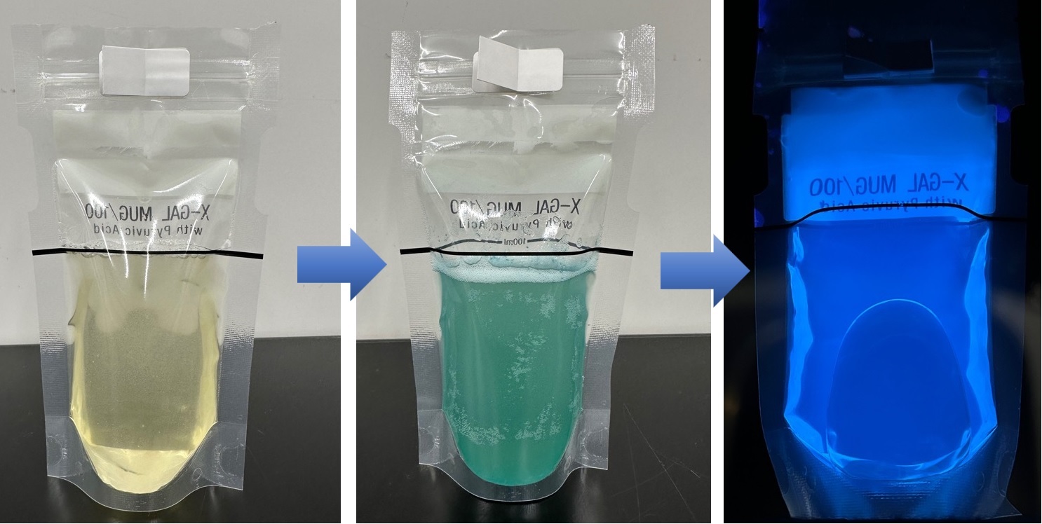 2⃣大腸菌群がいると水の色が変化し、大腸菌がいると紫外線を当てると蛍光を発します。