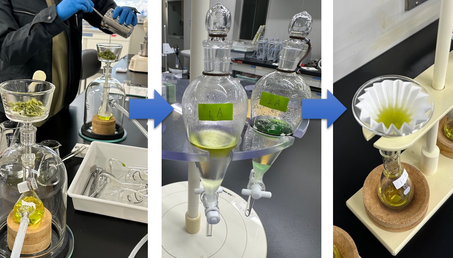 2⃣ろ過などを繰り返して不純物を少なくしながら、農薬を抽出します。