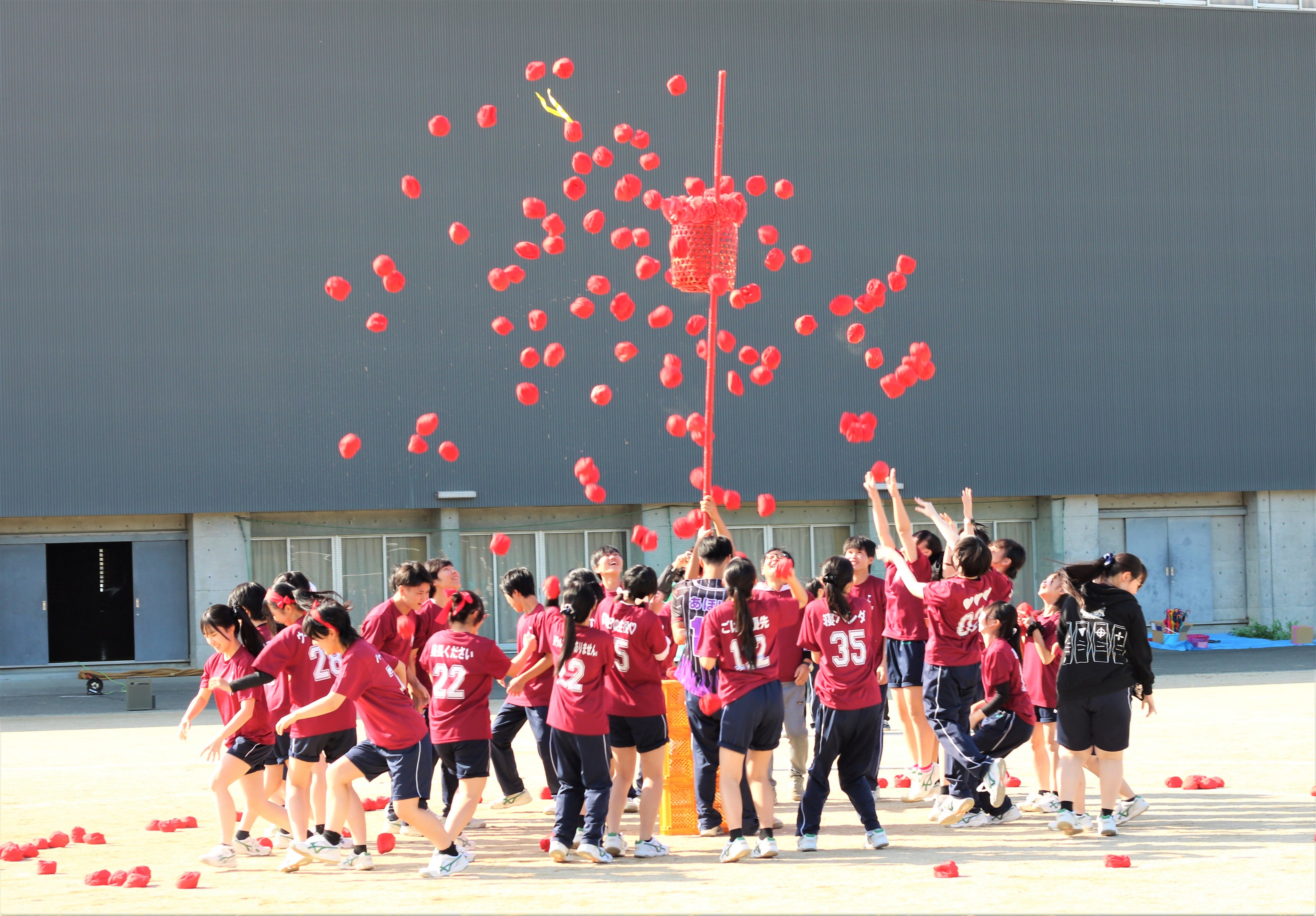 校内のスポーツ大会で、円陣を組んで団結力を高めている写真です。その後の綱引き大会では優勝することができました。