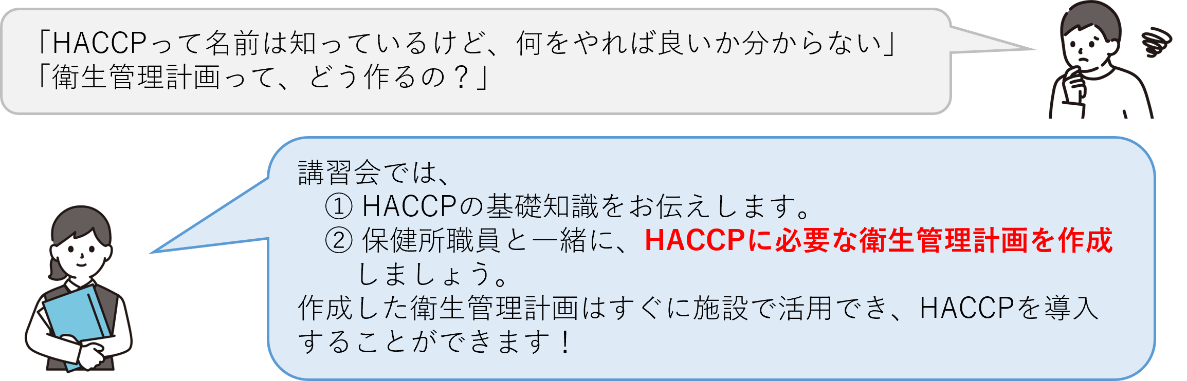 令和3年6月の食品衛生法の改正により、すべての食品等事業者がHACCPに沿った衛生管理を行うことが制度化されました。本講習会では、「HACCPの考え方を取り入れた衛生管理」を実施する施設向けに、HACCPに沿った衛生管理の基礎知識の習得や衛生管理計画の作成を行う講習を開催します。