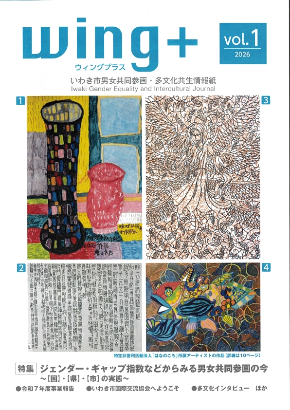 令和7年度からは、男女共同参画にとどまらず、多文化共生、人権、ユニバーサル等の内容を含めた情報を発信する情報紙としてリニューアルすることとし、いわき市男女共同参画・多文化共生情報紙「Wing+」(ウイングプラス)を発行しています。